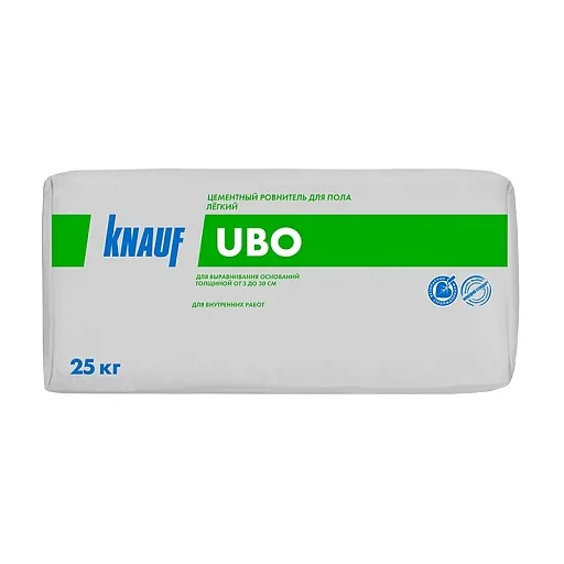 Ровнитель для пола Кнауф Убо – сухая строительная смесь для выравнивания уровня пола. Основным компонентом является цемент. В составе смеси присутствуют модифицирующие добавки и пенополистирольные гранулы. Облегченный, утепляющий, легко распределяется. Требует последующего твердого покрытия. Предназначен исключительно для внутренних работ.